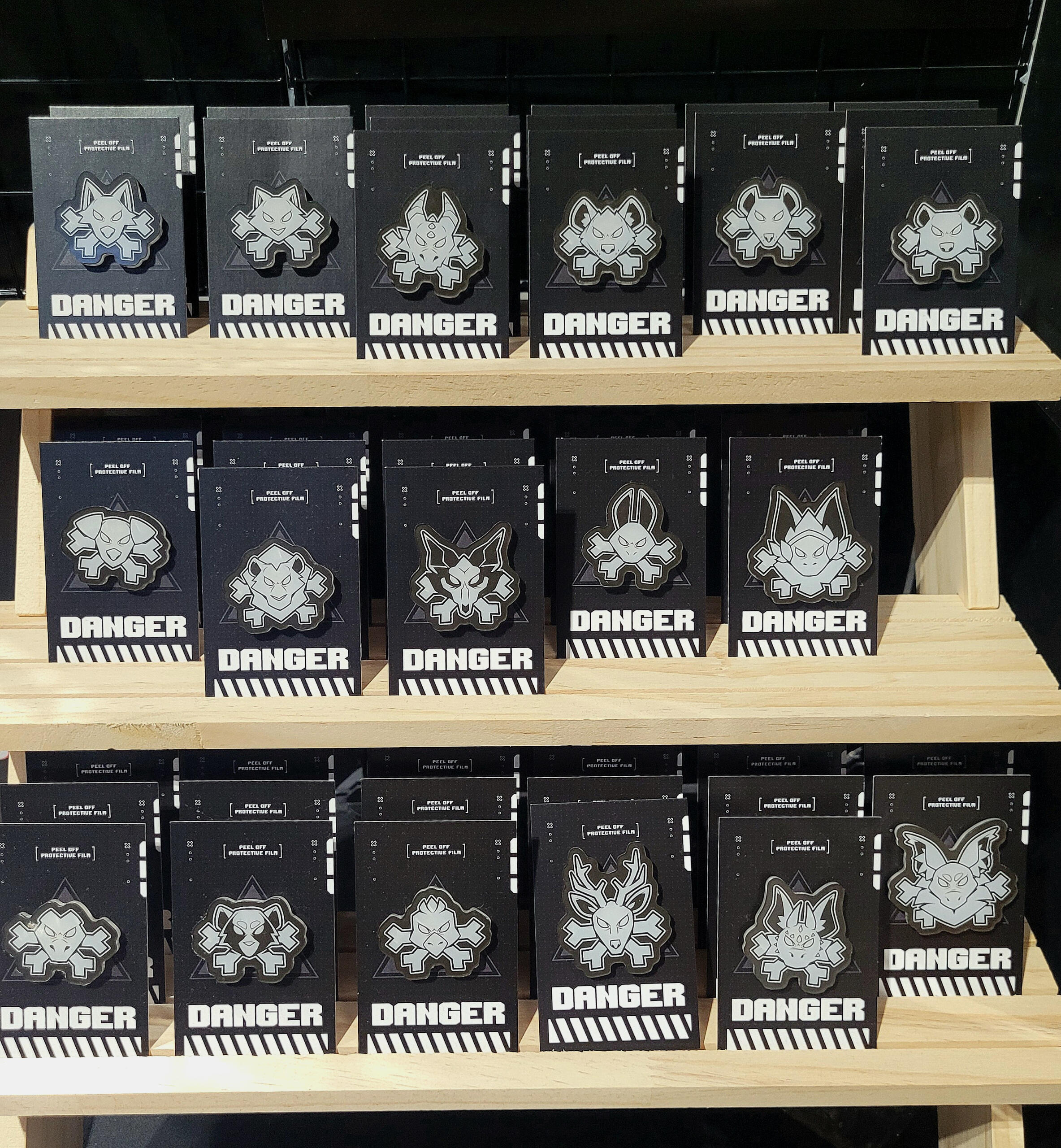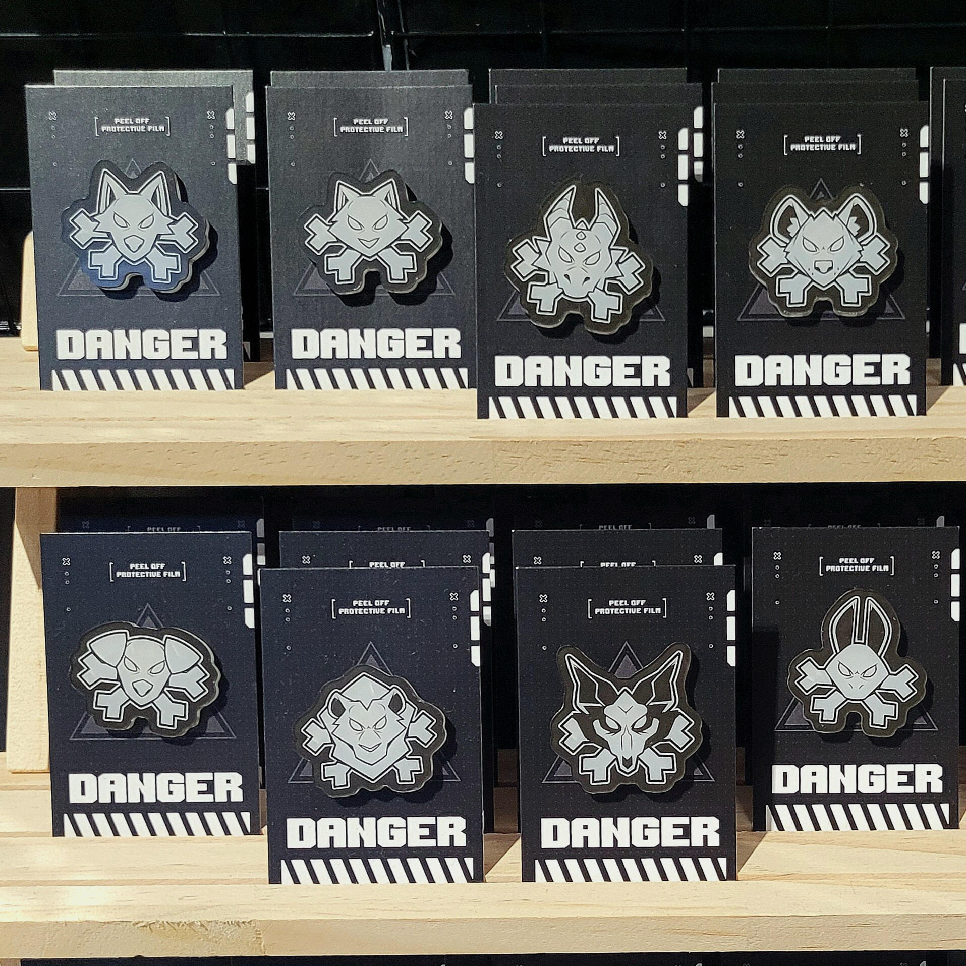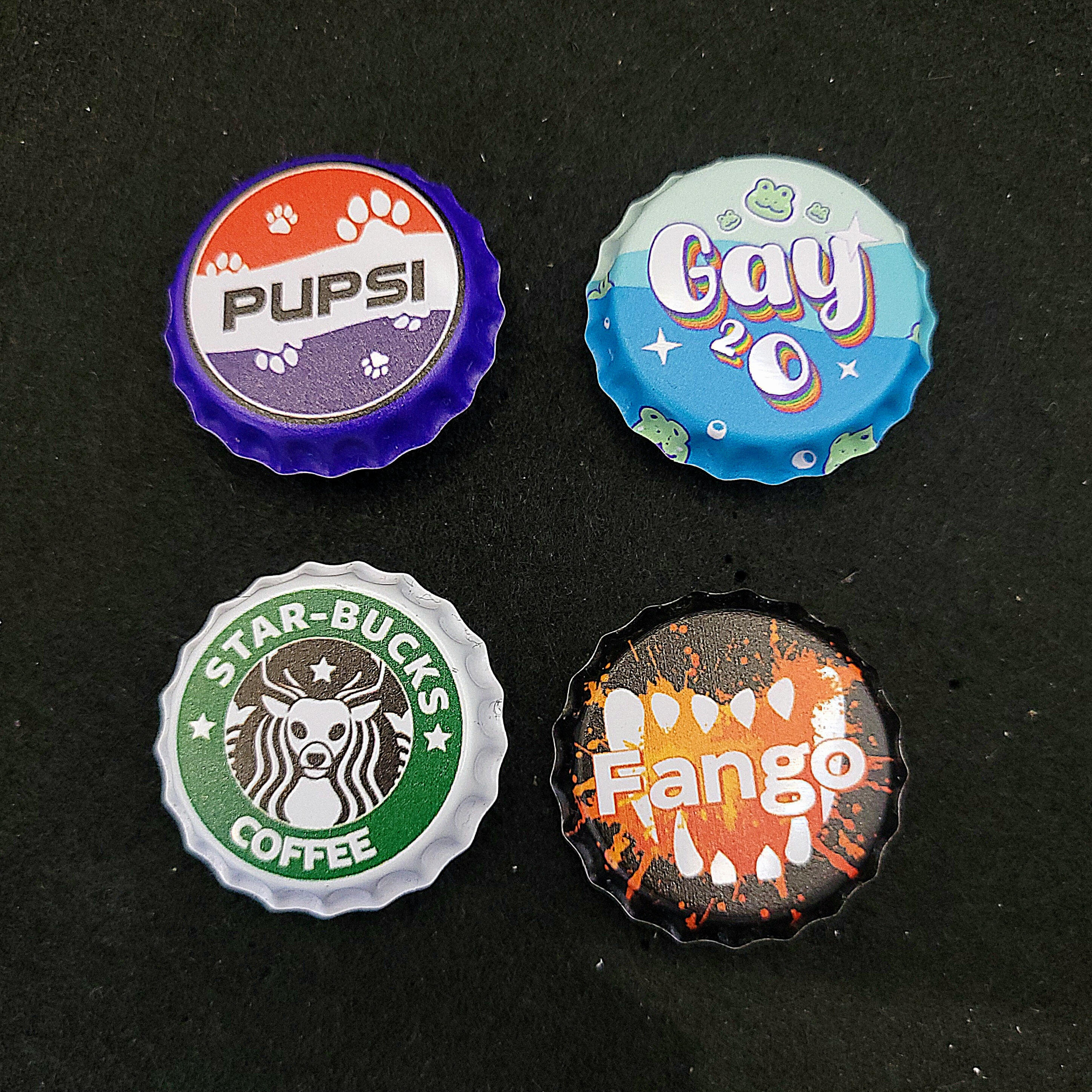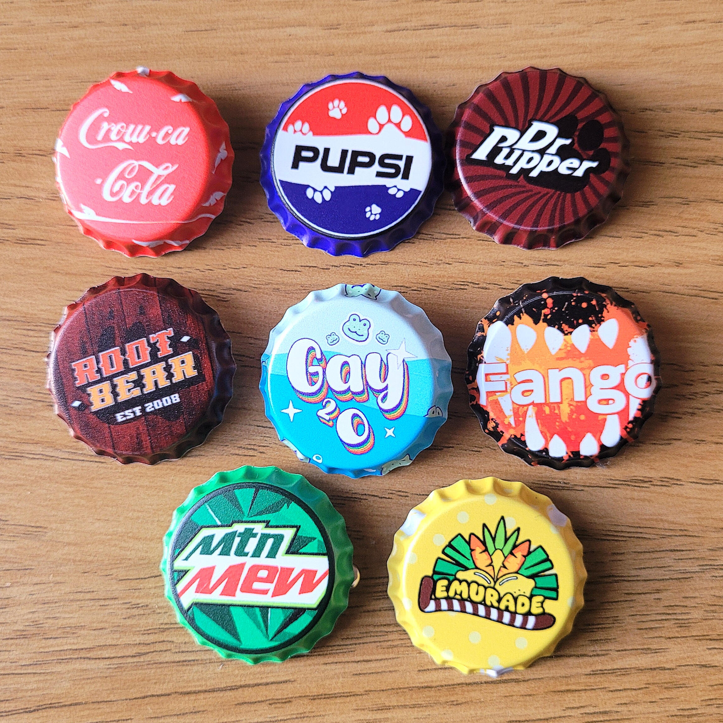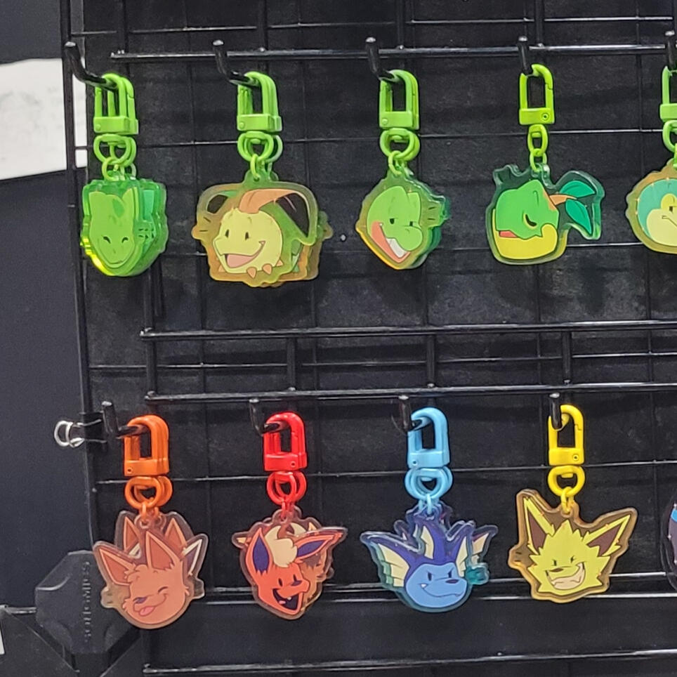 20+ designs are available in a variety of items, from standard acrylic keychains to wooden pins and humorous bottle cap-shaped tin badges.